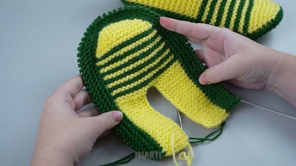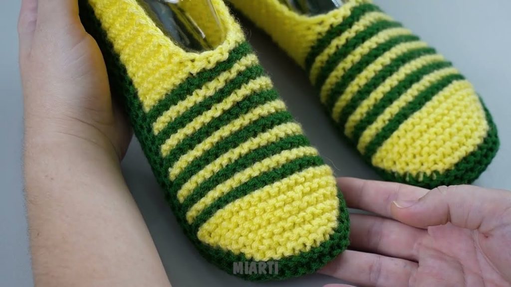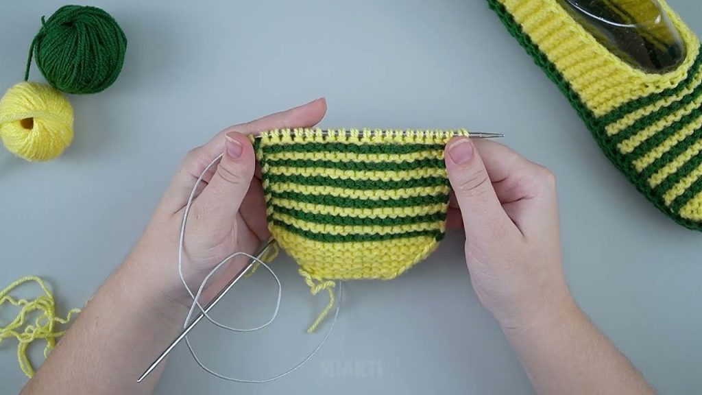 Now we’ll introduce the stripe color and knit the main body of the slipper.