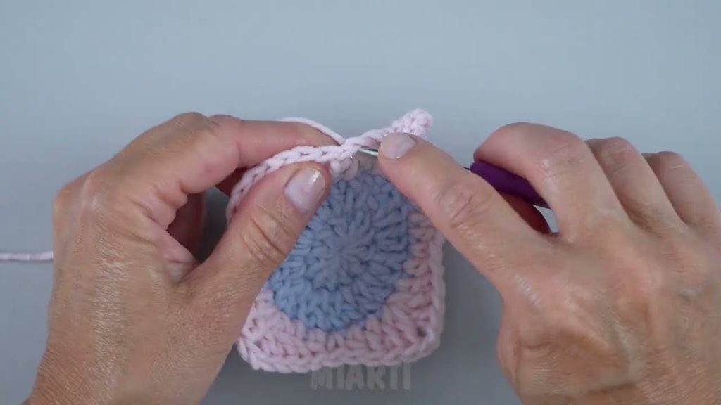 - Round 2: Sl st into the first ch-3 space. Ch 3 (counts as 1st dc). Work (2 dc, ch 3, 3 dc) into the same ch-3 space (first corner). Ch 1. Work (3 dc, ch 3, 3 dc) into the next ch-3 space (next corner). Repeat from * to * 2 more times. Ch 1, sl st to top of beginning Ch 3.