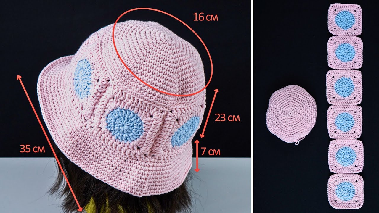 The hat is constructed by first making individual granny squares, then joining them to form the crown and sides, and finally adding a brim.