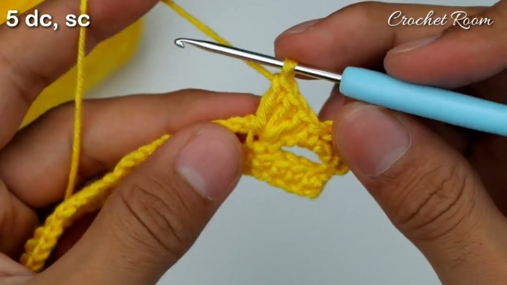 - The final St will be an SC in the top of the turning Ch-3 from Row 4. Ch 3 (counts as a DC). Turn. (This row is a dense solid row that sets up the next repeat.)