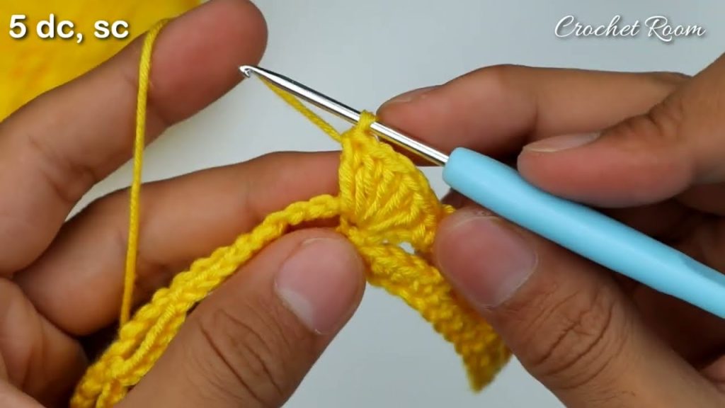 - *5 DC into the Ch-1 space of the V-st (this is the peak of the shell). SC in the next DC (the one between V-sts).*