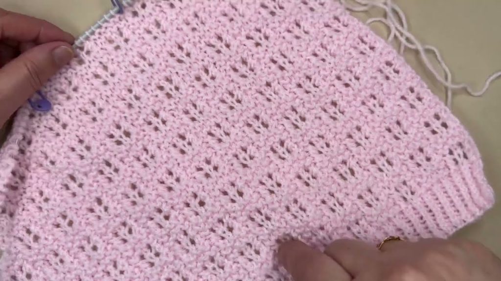 - Divide: Divide the work into two equal parts: 30 stitches for the left side, 30 stitches for the right side, and a central 7-stitch button band (which will be added to one side).