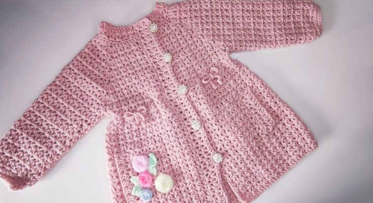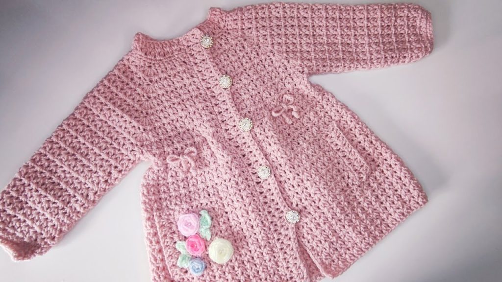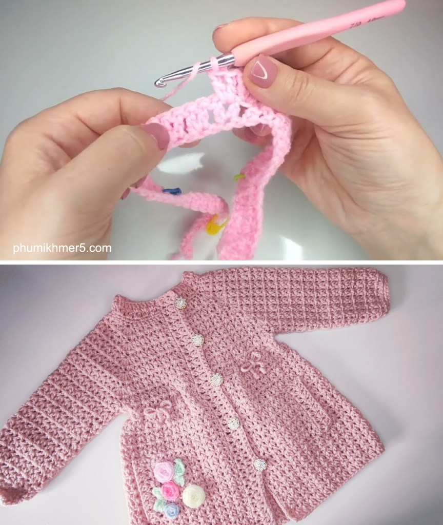 - Row 2 (Buttonholes – WS): Ch 1. HDC in the first 3 stitches. Ch 2, Skip 2 stitches (buttonhole), HDC in the next 10 stitches. Repeat buttonhole sequence up the entire left edge (this will be the buttonhole band). HDC across the neckline and down the right edge. Turn.