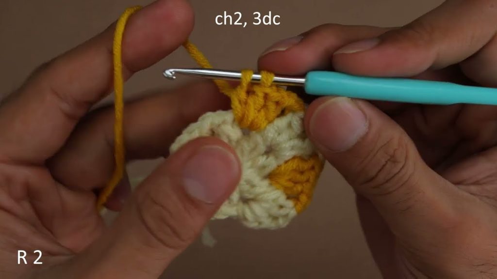 Round 2 (Puff Round): Ch 1 (does not count as St), PS in the same St, Ch 1. *Sk 1 DC, PS in the next DC, Ch 1. Rep from * around. Sl St to the top of the Beg PS to join. (6 PS)