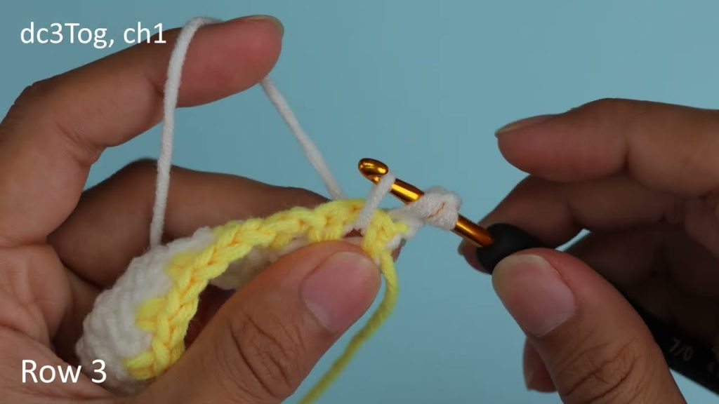 - Dc in the last 2 sts (the securing ch-1 of the last PS, and the turning ch-2 of the previous row).