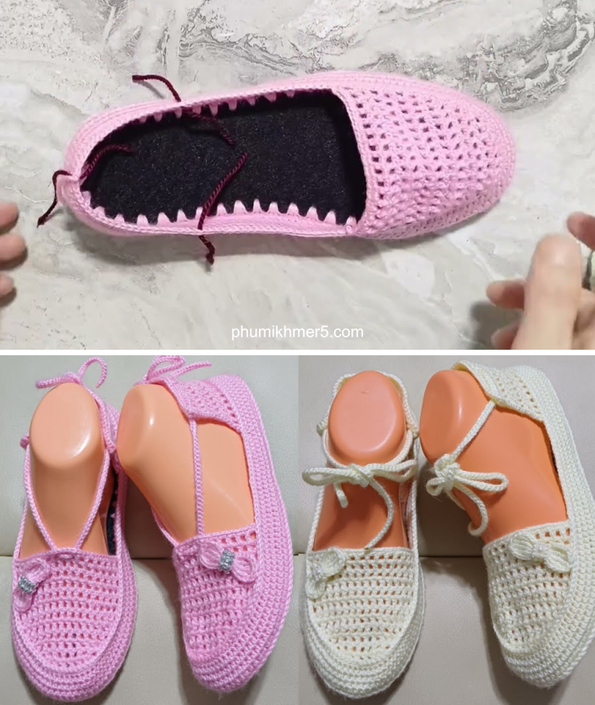 Inspired by beautiful summer slipper designs worked on a ready-made sole, this pattern combines comfort with style. The use of the filet mesh technique (a simple repetition of double crochet and chain) creates a light, breathable fabric, making it ideal for indoor wear during spring and summer.