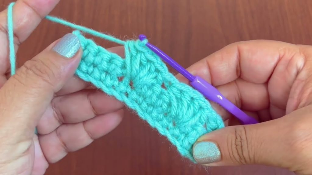 - Rep from * across, ending with: 3 DC into the last Ch-1 Sp, SC into the top of the turning Ch 3. Ch 3 (counts as 1st DC), turn.