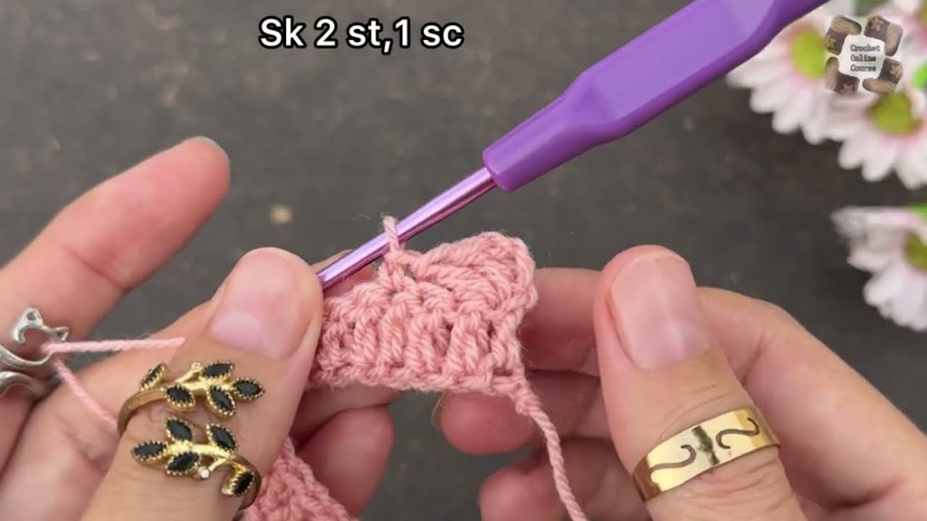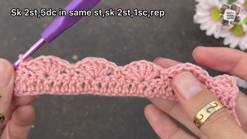 - *Skip 2 sts, work shell (DC, Ch 1, DC) into the next st.*