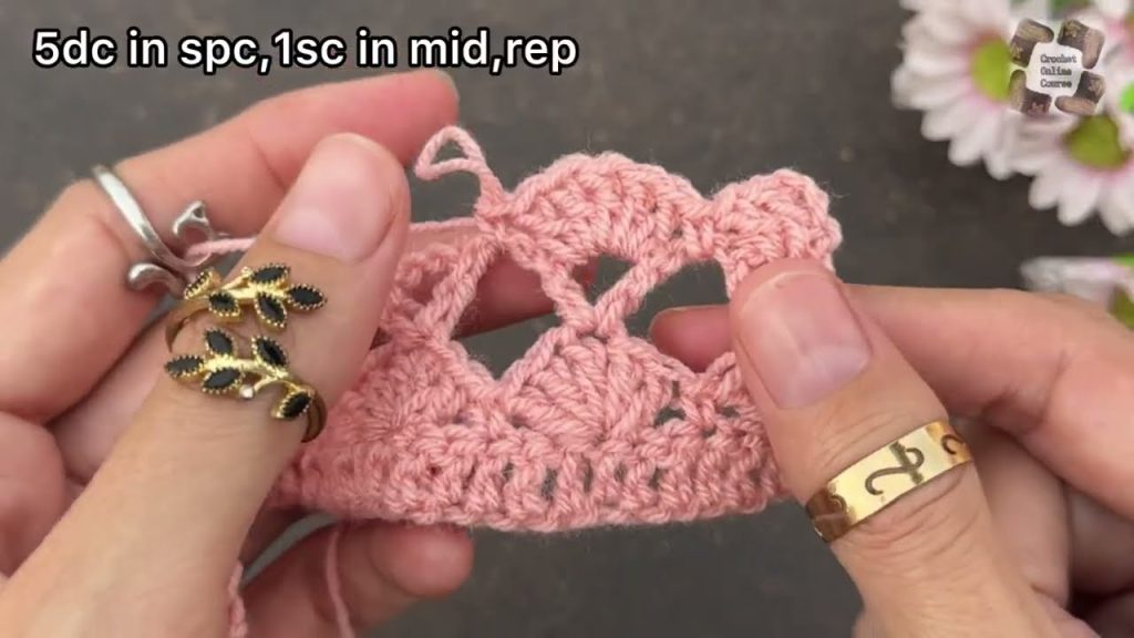 - *Skip 2 sts, work shell (DC, Ch 1, DC) into the SC st that falls in the center of the shell from Row 1.*