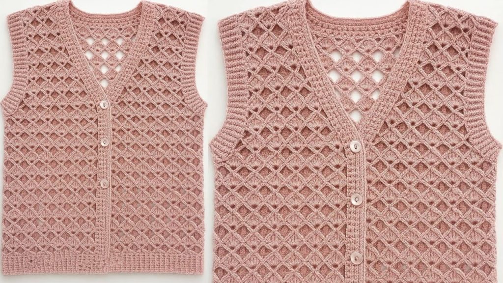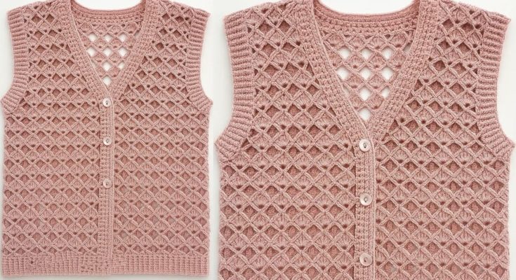 - Final Row (Shoulder Edge): Ch 1, turn. SC into the first st and SC into every st and Ch-space across. Fasten off the left panel. Leave a 30-inch tail on the right panel for seaming.