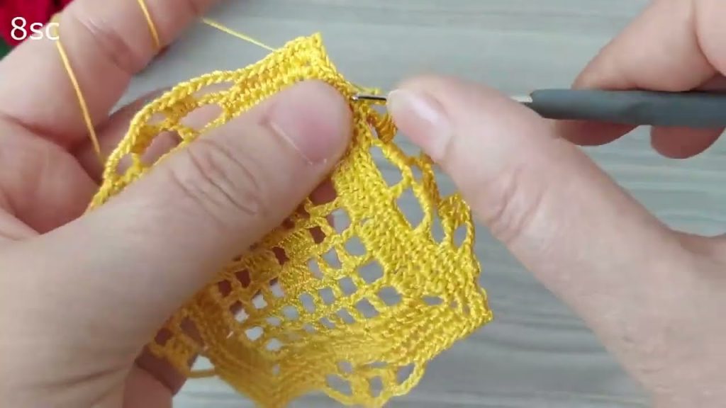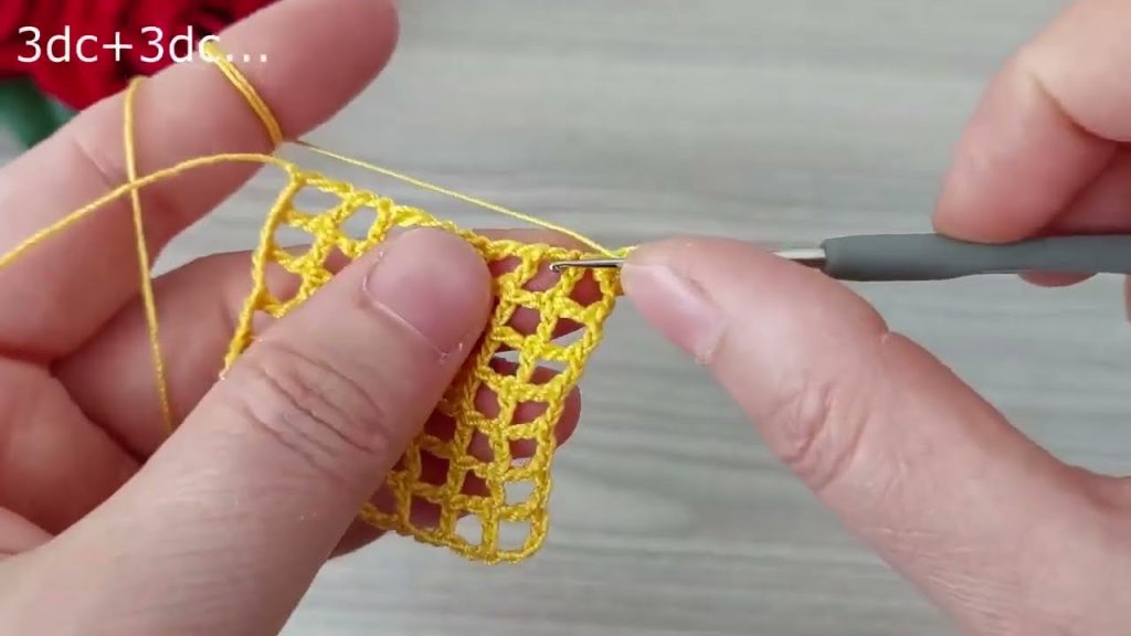 - Dc in next st, ch 2, sk 2 sts, dc in next st repeat across.