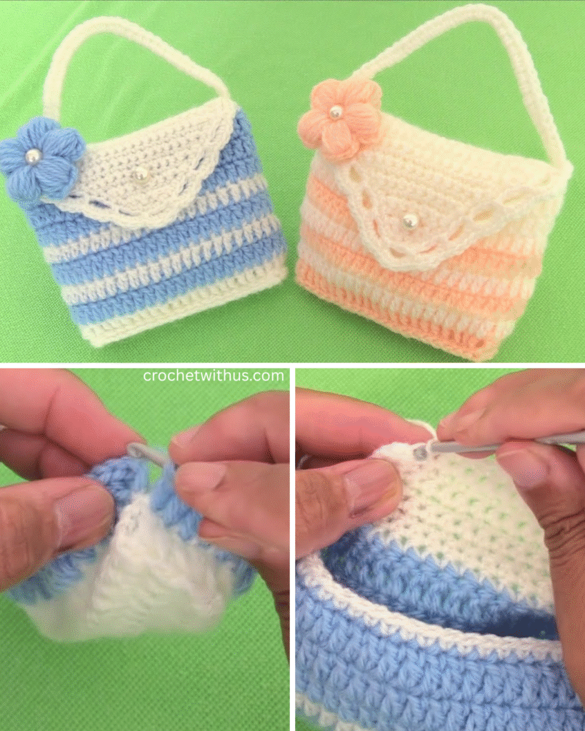 - Use sc or sl st to seam the sides and bottom.