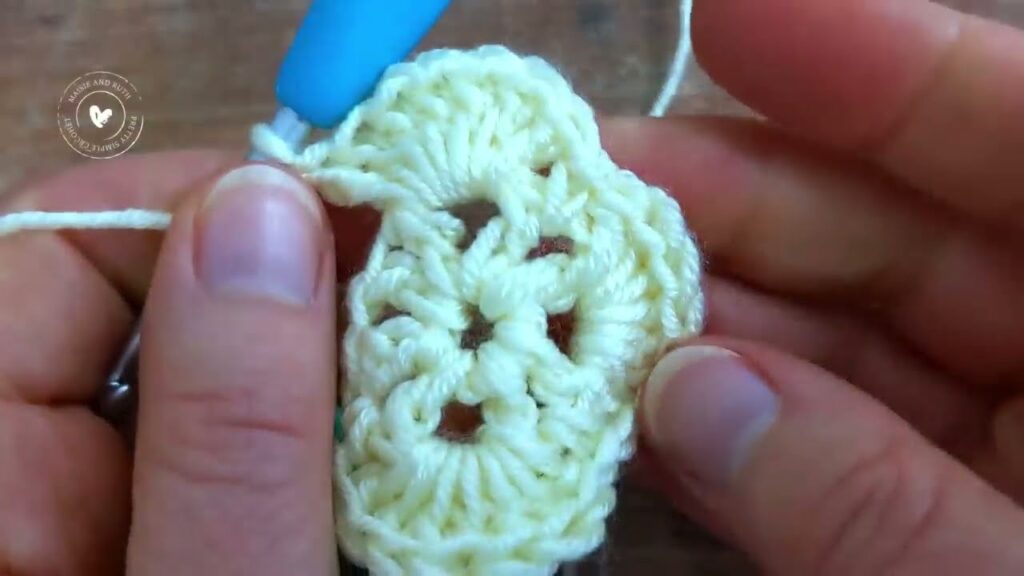 Join with sl st to top of ch 3. (You’ll have 4 shell clusters and 4 ch-2 spaces = corners.)